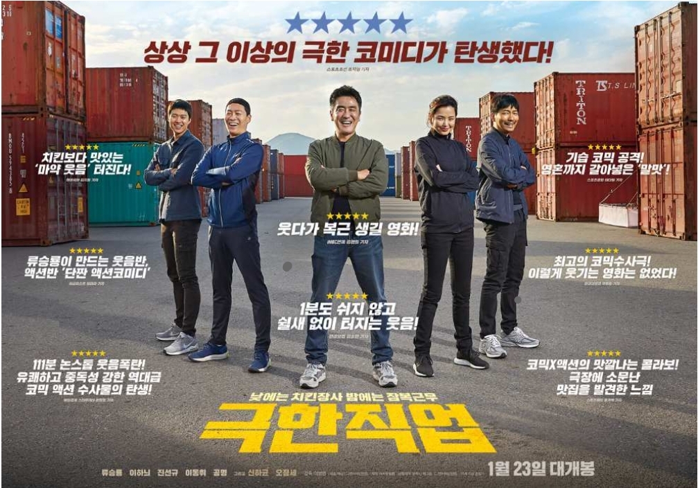 결과적으로, 극한직업은 유머, 액션, 긴장감을 적절히 섞어 낸 눈요깃거리인 작품입니다. 웃음 포인트뿐만 아니라 긴장감을 동시에 선사하며, 주인공들의 개성과 팀워크를 돋보이게 하여 관객들에게 감동을 줍니다. 영화를 보는 내내 끊임없이 유쾌하고 긴장감이 사라지지 않는 극한직업은 관람자들에게 새로운 코미디 영화의 한 권역을 제시한다고 할 수 있습니다. 다양한 연령층의 이들이 함께 즐길 수 있는 웃음과 긴장감, 동시에 오락 영화로서의 재미까지 담아낸 극한직업은 추천할만한 작품이라 할 수 있습니다.