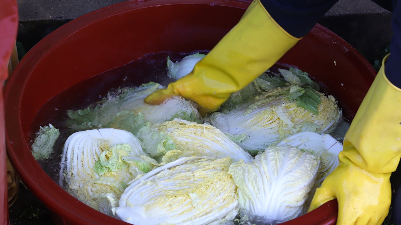 2. 절임: 절임용 소금물을 만들기 위해 물에 약 1kg의 소금을 푼 뒤 배추를 넣고 약 2~3시간 동안 절여줍니다. 배추가 부드러워질 때까지 절여야 합니다.