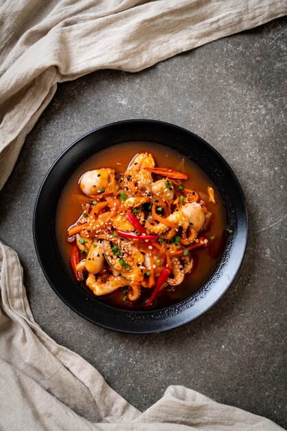 - 팬에 식용유를 두르고 다진 마늘을 볶다가 오징어와 채소를 넣고 볶아줍니다. 채소는 양파, 당근, 대파 등을 사용할 수 있습니다.